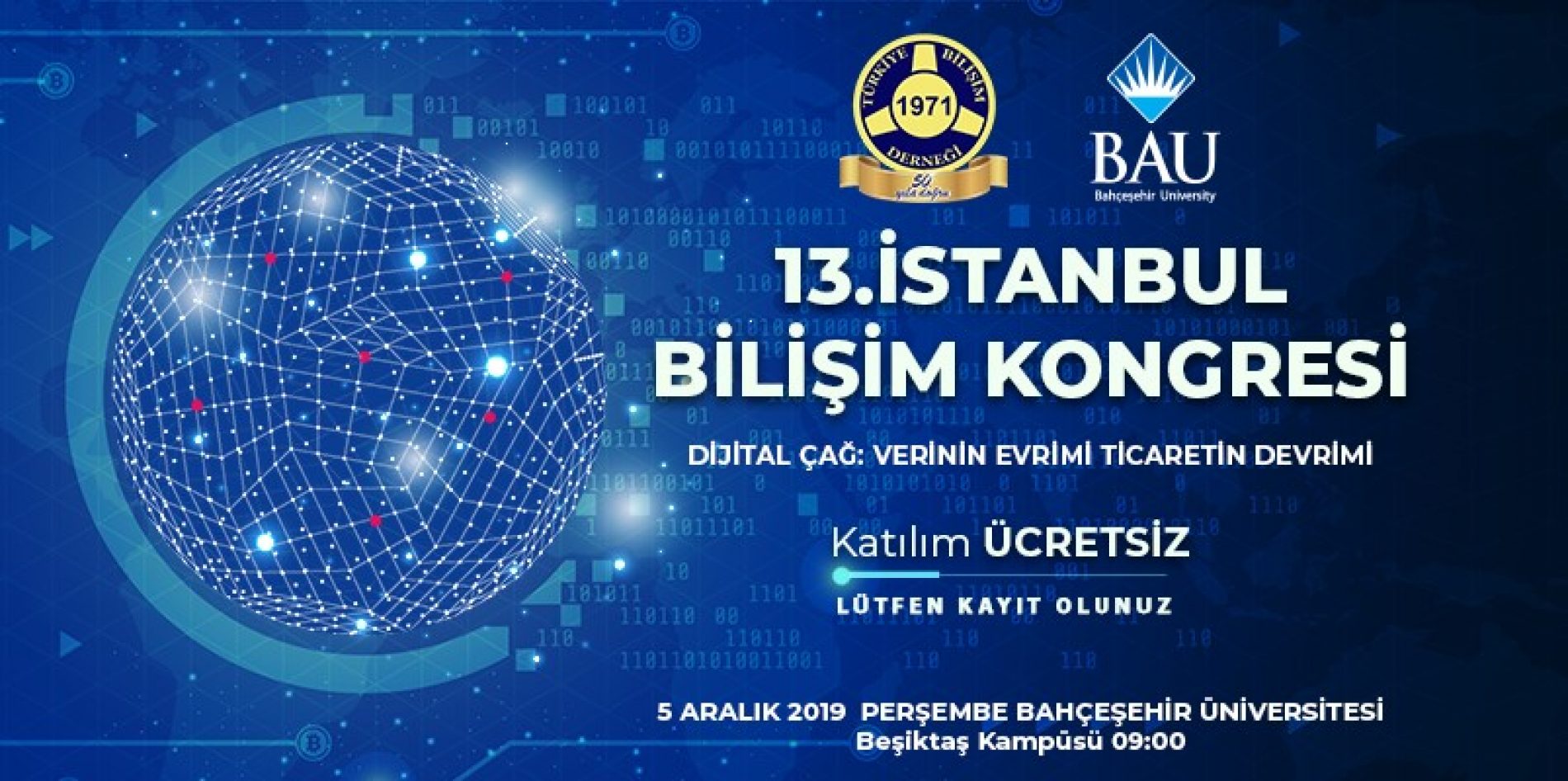 Türkiye Bilişim Derneği İstanbul Şubesi olarak Bahçeşehir Üniversitesi ile birlikte düzenleyeceğimiz 13. İstanbul Bilişim Kongresi bu sene “Dijital Çağ: Verinin Evrimi Ticaretin Devrimi” temasıyla 5 Aralık 2019 tarihinde Bahçeşehir Üniversitesi Beşiktaş Kampüsü’nde yapılacaktır.