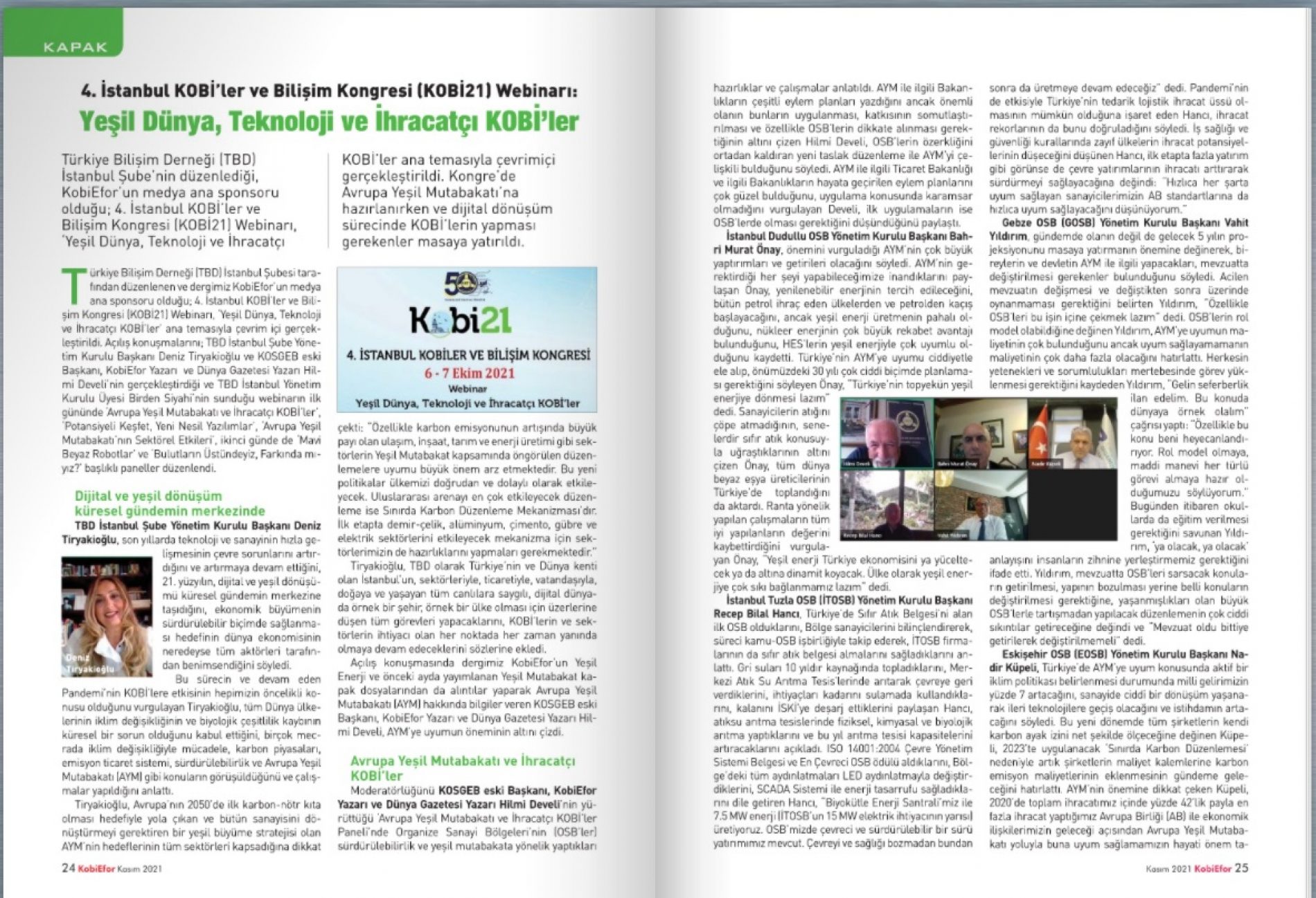 Türkiye Bilişim Derneği (TBD) İstanbul Şube’nin düzenlediği, KobiEfor’un medya ana sponsoru olduğu; 4. İstanbul KOBİ’ler ve Bilişim Kongresi (KOBİ21) Webinarı, ‘Yeşil Dünya, Teknoloji ve İhracatçı KOBİ’ler ana temasıyla çevrimiçi gerçekleştirildi. Kongre’de Avrupa Yeşil Mutabakatı’na hazırlanırken ve dijital dönüşüm sürecinde KOBİ’lerin yapması gerekenler masaya yatırıldı.