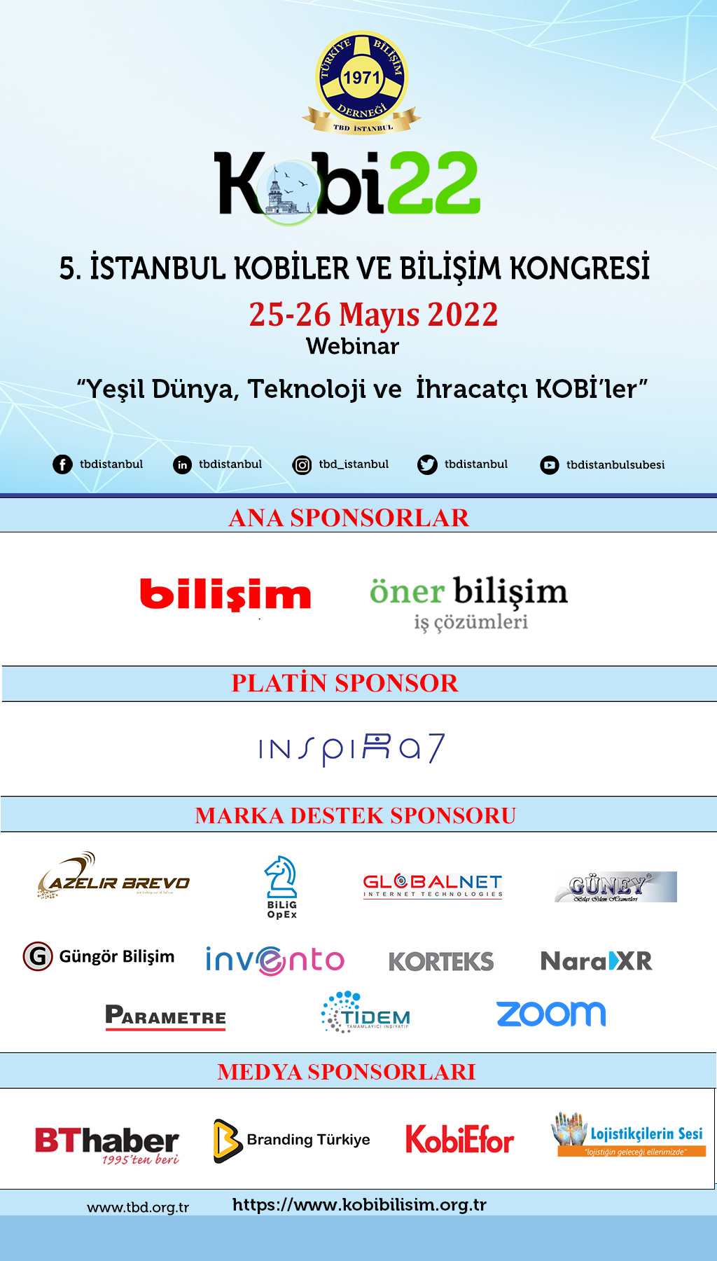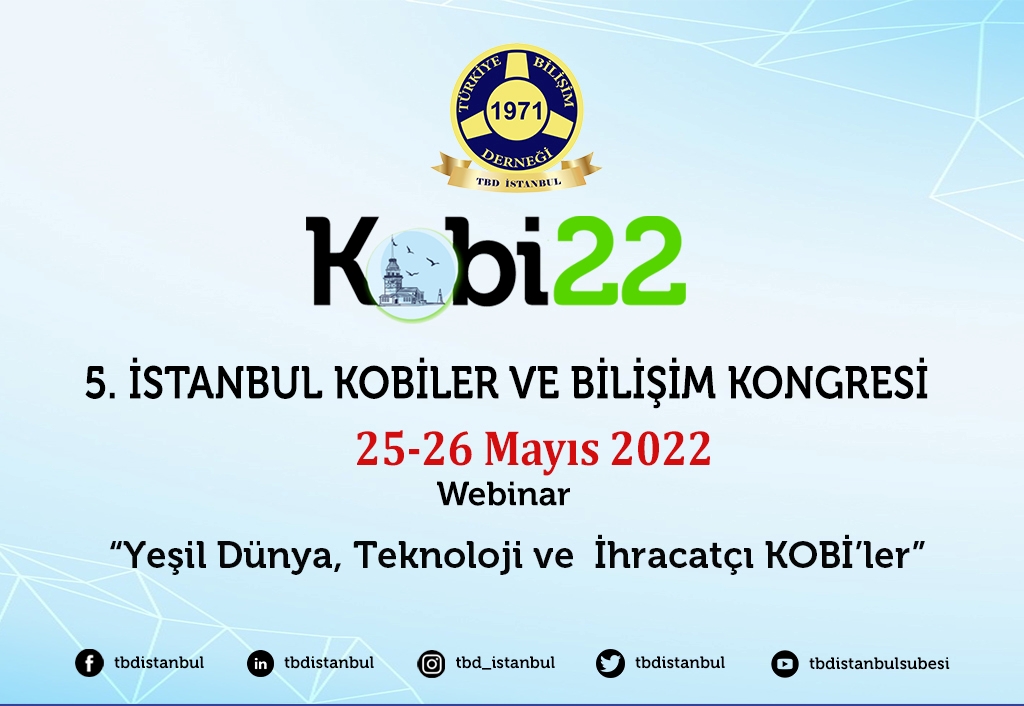 Türkiye Bilişim Derneği İstanbul Şubesi tarafından düzenlenen 5. İstanbul KOBİ’ler ve Bilişim Kongremiz bu sene 25-26 Mayıs 2022 tarihlerinde çevrim içi olarak yapılacaktır. Temamız “Yeşil Dünya, Teknoloji ve İhracatçı KOBİ’ler”