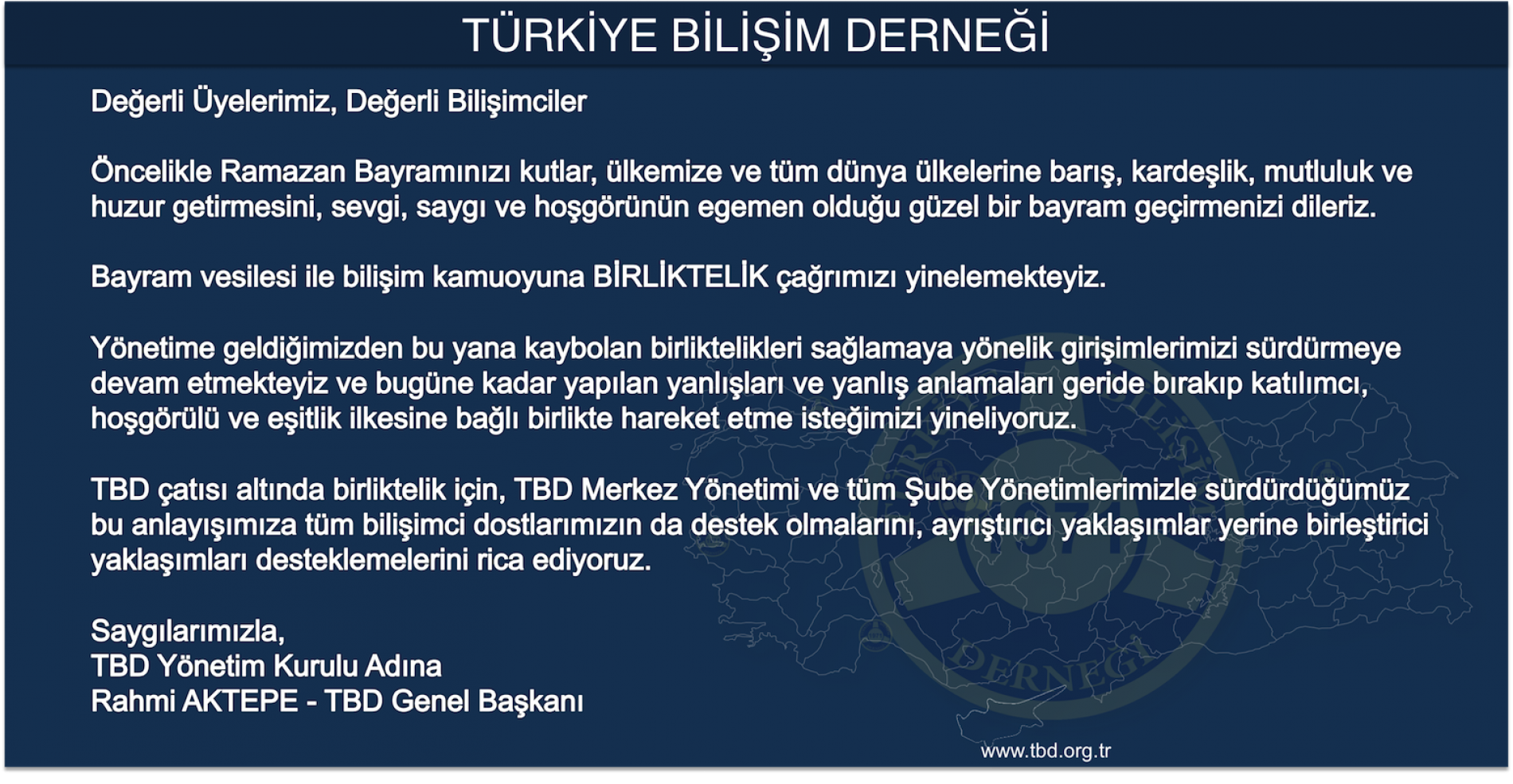 TBD çatısı altında BİRLİKTELİK için, TBD Merkez Yönetimi ve tüm Şube Yönetimlerimizle sürdürdüğümüz bu anlayışımıza tüm bilişimci dostlarımızın da destek olmalarını, ayrıştırıcı yaklaşımlar yerine birleştirici yaklaşımları desteklemelerini rica ediyoruz.