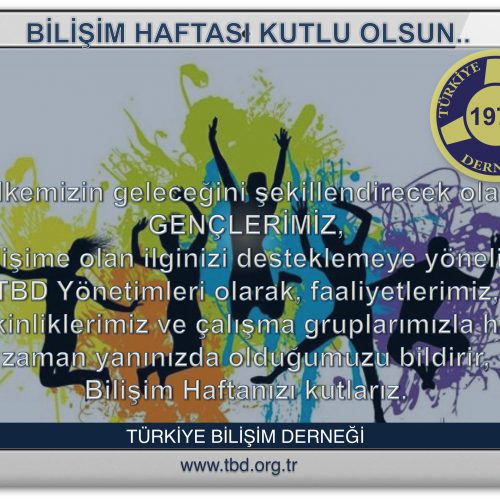 Ülkemizin geleceğini şekillendirecek olan GENÇLERİMİZ, Bilişime olan ilginizi desteklemeye yönelik, TBD Yönetimleri olarak, faaliyetlerimiz, etkinliklerimiz ve çalışma gruplarımızla her zaman yanınızda olduğumuzu bildirir, Bilişim Haftanızı kutlarız. TÜRKİYE BİLİŞİM DERNEĞİ >>>