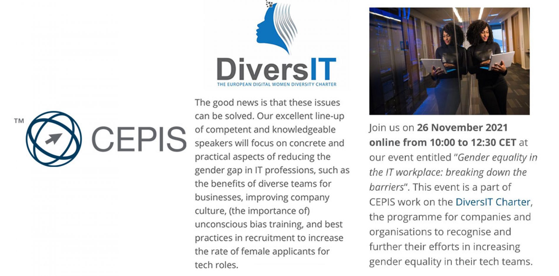 26 Kasım 2021’de CEPIS (Avrupa Birliği Bilişim Federasyonu) tarafından düzenlenen etkinlik 10:00 – 12:30 (Avrupa saatine göre) arasında çevrimiçi olarak yapılacaktır. “BT alanında cinsiyet eşitliği: engelleri yıkmak” başlıklı etkinliğimize katılımınızı bekliyoruz. Bu etkinlikte şirketlerin ve kuruluşların teknoloji ekiplerinde toplumsal cinsiyet eşitliğini artırma yolundaki çabalarını teşvik etmek amacıyla hazırlanan program olan DiversIT tüzüğü tanıtılacaktır. Ayrıca bu yolda ödül alan İzlanda ve Türkiye Bilişim Dernekleri deneyimlerini paylaşacaktır.