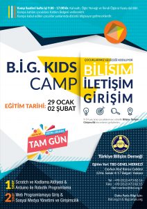 Türkiye Bilişim Derneği olarak B.İ.G. Kids Camp adı altında 9-14 yaş arası çocuklara yönelik Bilişim, İletişim ve Girişimcilik becerilerini geliştirmeleri için eğitim kampı düzenlemekteyiz. 29 Ocak – 2 Şubat 2018 tarihlerinde iki dönem olarak uygulanacak eğitim kampı konu başlıkları ve diğer ayrıntılar aşağıda bilginize sunulmuştur.