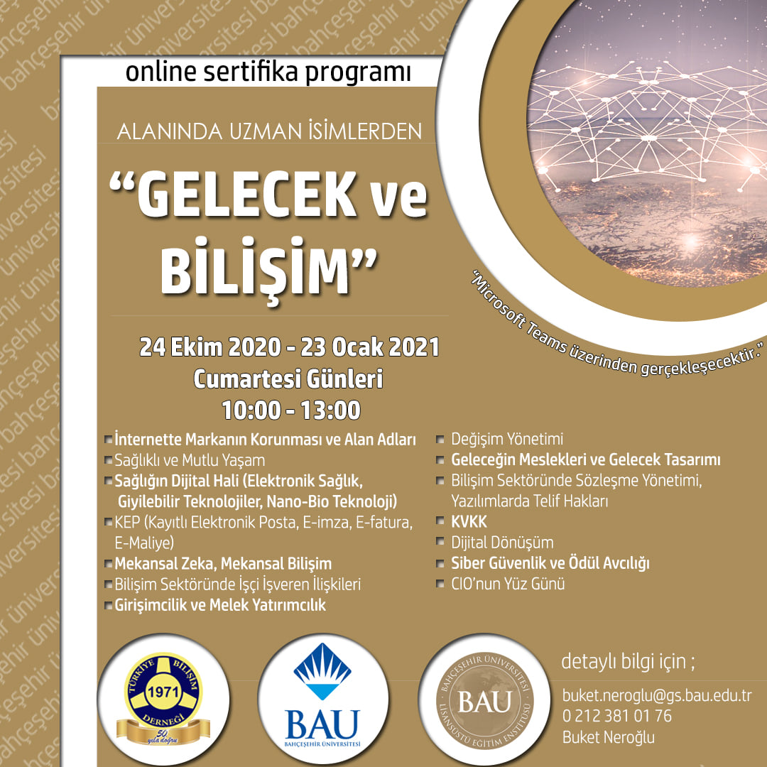 Bahçeşehir Üniversitesi ile TBD İstanbul Şubesi olarak birlikte düzenlediğimiz, Bilişim sektörünün Duayen Profesyonellerinin eğitmen olarak yer aldığı, “Bilişim ve Gelecek Sertifika Programı” başlıyor. Katılımcılara bilişim sektörünün en önemli trendlerinin iş dünyasına etkisinin ve gelecek yeni dünya iş düzeninin anlatılacağı sertifika programını kaçırmayınız.