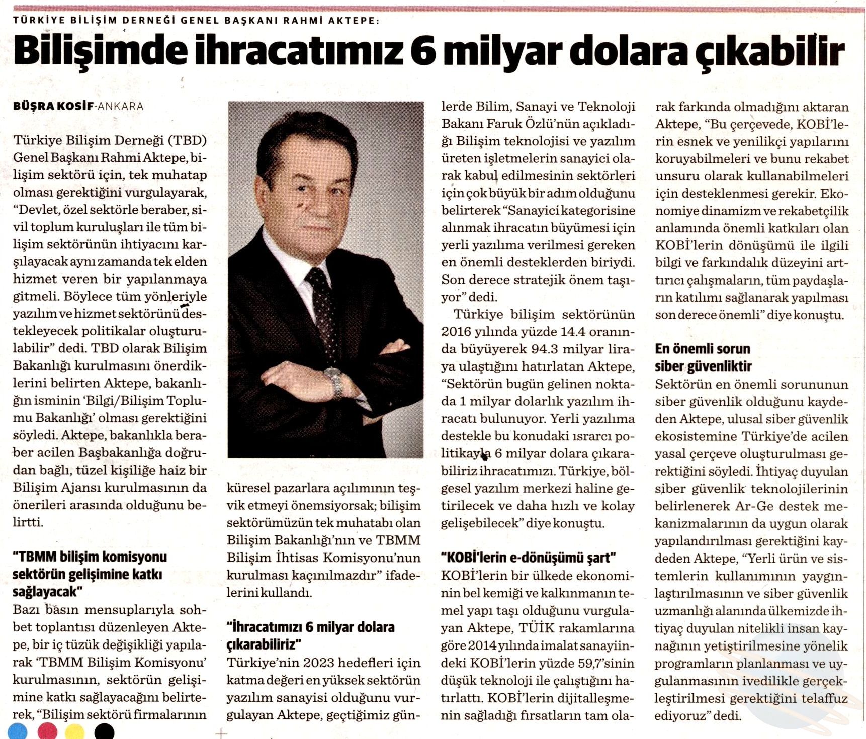 • Bilişimde İhracatımız 6 Milyar Dolara Çıkabilir – Dünya Gazetesi