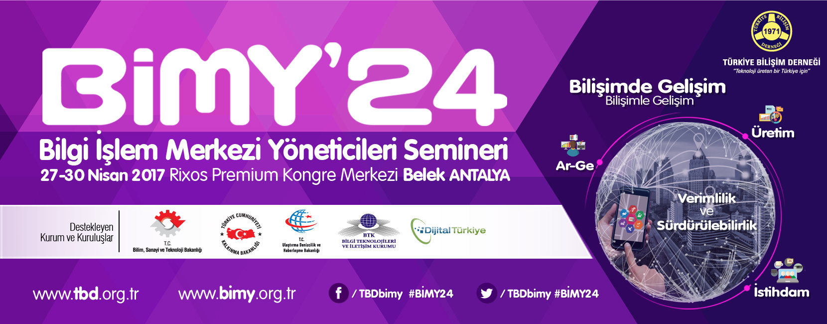 Geleneksel TBD etkinliklerinden olan “Bilişimde Bahar Buluşması” olarak bilinen BİMY’24, “27-30 Nisan 2017” tarihlerinde “Bilişimde Gelişim, Bilişimle Gelişim” ana teması ile RIXOS Premium Kongre Merkezi, Belek Antalya’da gerçekleştirildi.
