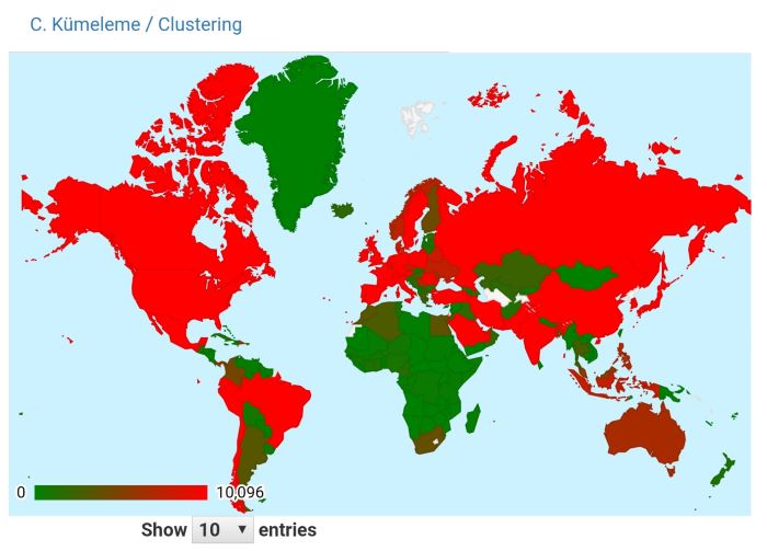 Kümeleme Analizi ekranında; veriye dayalı öğrenme algoritmalarından biri olan k-Ortalamalar Kümeleme Algoritması ile istenilen küme sayısına göre ülkeler benzerliklerine göre hem harita üzerinde hem de tabloda gösterilerek kullanıcıların yorumlarına ve görüşlerine sunulmuştur. Uygulamanın en önemli özelliği veri kaynağına göre dinamik olarak çalışabilmesi ve raporun otomatik olarak güncellenmesidir. Veri, harita ve grafik okuryazarları için faydalı bilgi sunmasını ve karar vericiler için rasyonel ve proaktif kararların verilmesinde faydalı olabilmesi en büyük dileğimizdir.