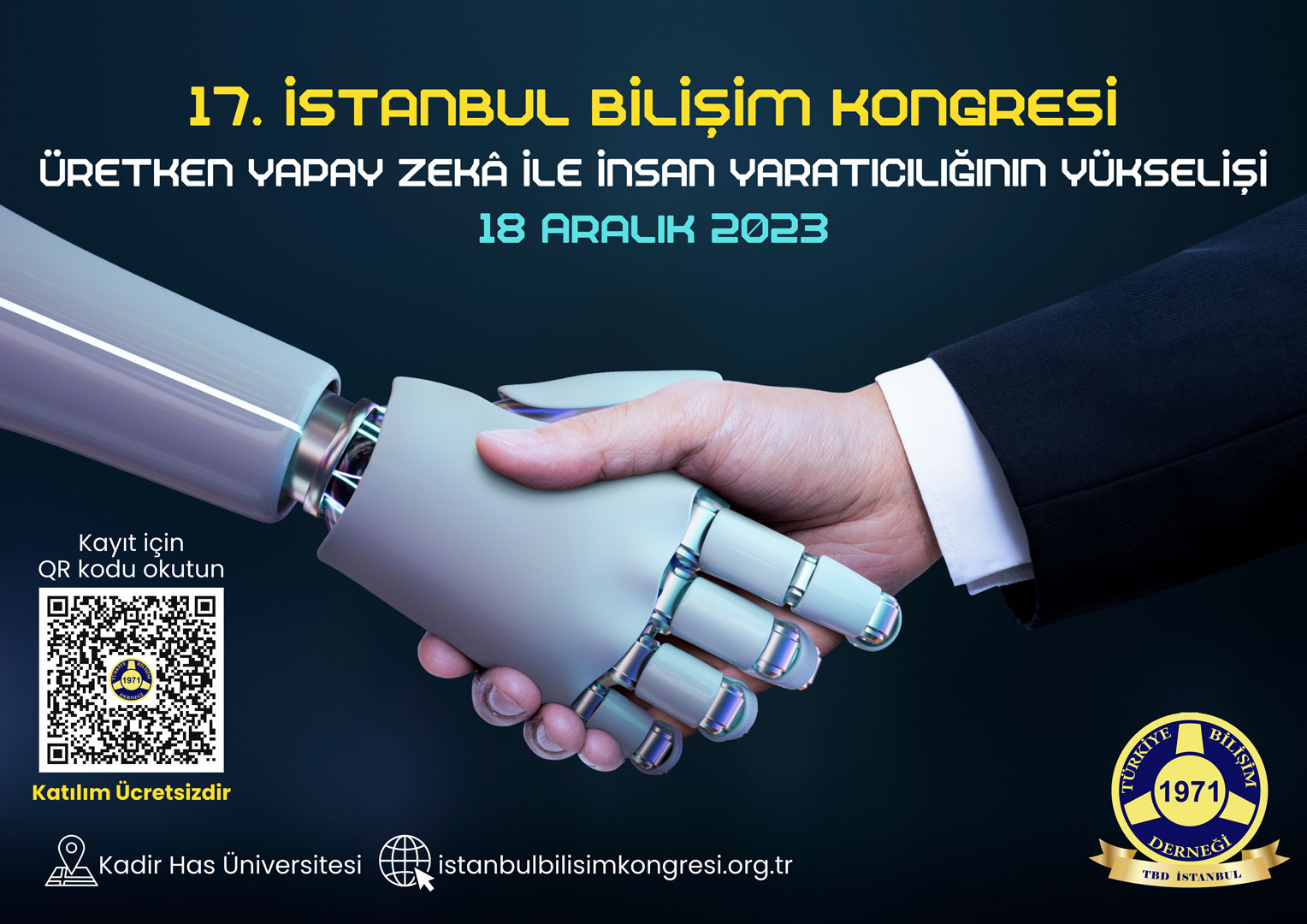 Türkiye Bilişim Derneği İstanbul Şubesi tarafından düzenlenen 17. İstanbul Bilişim Kongremiz bu sene 18 Aralık 2023 tarihinde Kadir Has Üniversitesi Üniversitesi’nde yapılacaktır. Temamız “Üretken Yapay Zekâ ile İnsan Yaratıcılığının Yükselişi”