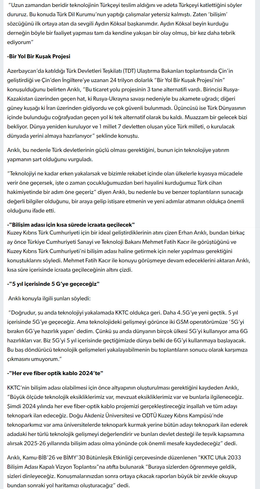 Arıklı: 2024 Yılında Her Eve Fiber-Optik Kablo Projemizi Gerçekleştireceğiz – KIBRIS AYRINTI