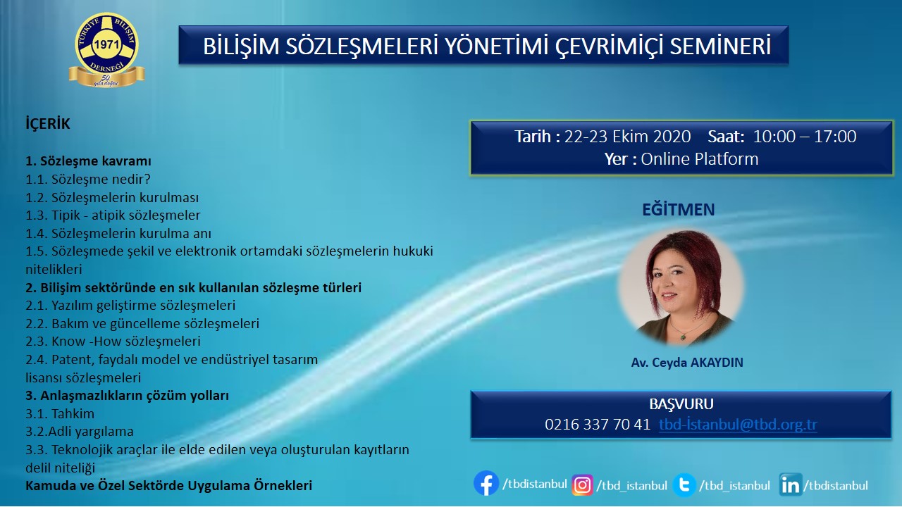 Av. Ceyda AKAYDIN tarafından verilen “Bilişim Sözleşmeleri Yönetimi” Seminerimiz 5-6 Kasım 2020 tarihlerinde online ortamda gerçekleştirilmiştir.