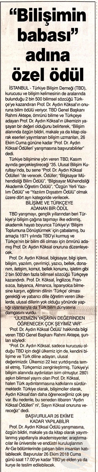 • “Bilişimin Babası” Adına Özel Ödül – TÜNAYDIN GAZETESİ