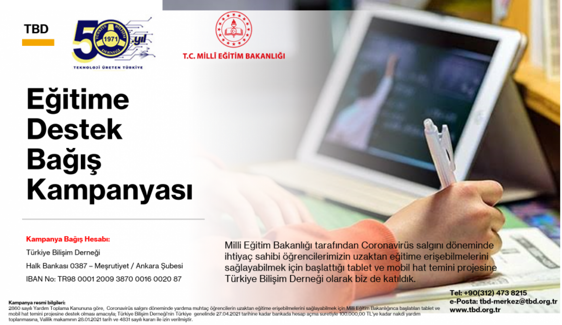Kampanyamız halen devam etmekle birlikte bilgisayar ve tableti olmayan ama bağış yapmak isteyen katılımcılarımız için Milli Eğitim Bakanlığı tarafından Coronavirüs salgını döneminde ihtiyaç sahibi öğrencilerimizin uzaktan eğitime erişebilmelerini sağlayabilmek için başlattığı tablet ve mobil hat temini projesine Türkiye Bilişim Derneği olarak biz de katıldık. Derneğimiz tarafından bu kampanya için özel hesap açılmıştır. Destek vermek isteyen ilgililerimizin aşağıdaki hesaba bağış yapmalarını bildiririz.