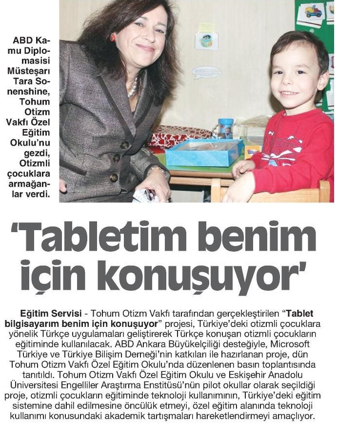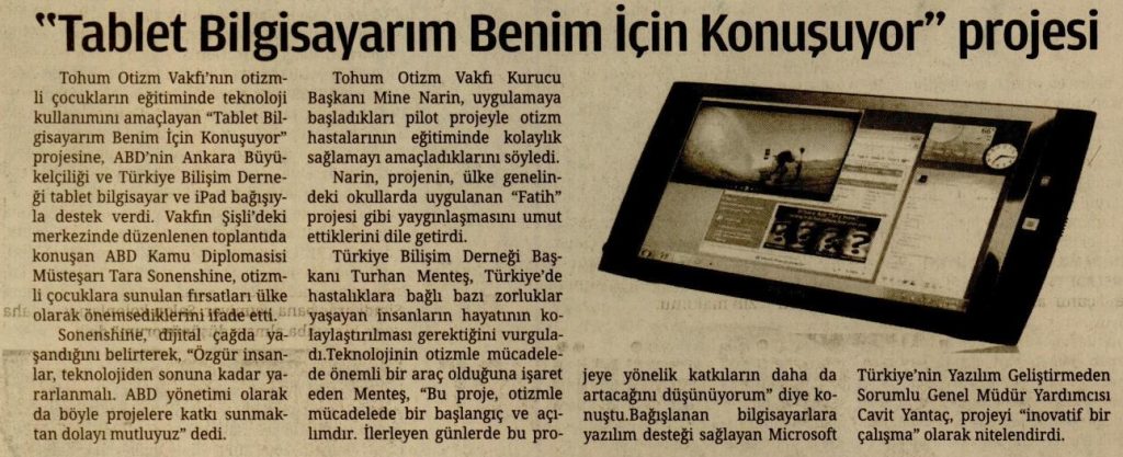 ABD Ankara Büyükelçiliği  desteğiyle Tohum Otizm Vakfı tarafından gerçekleştirilen ve Microsoft Türkiye ve Türkiye Bilişim Derneğinin katkıları ile genişleyen  “Tablet bilgisayarım benim için konuşuyor” projesi basın toplantısı ABD Kamu Diplomasisi Müsteşarı Tara Sonenshine, Türkiye Bilişim Derneği Başkanı Turhan Mentes, Microsoft Yazılım Gelistirmeden Sorumlu Genel Mudur Yardımcısı Cavit Yantac ,Tohum Otizm Vakfı Kurucu Başkanı Mine Narin ve Tohum Otizm Vakfı Yönetim Kurulu Üyelerinin katılımı ile yapıldı.