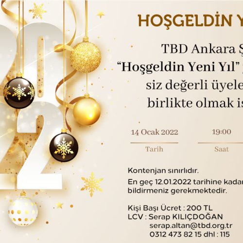 TBD Ankara Şubesi “Hoşgeldin Yeni Yıl” yemeğimizde siz değerli üyelerimiz ile birlikte olmak istiyoruz. Yer : Cafe Daren a’Mor Saat : 19.00 Tarih : 14 Ocak 2022 Kontenjan sınırlıdır. En geç 12.01.2022