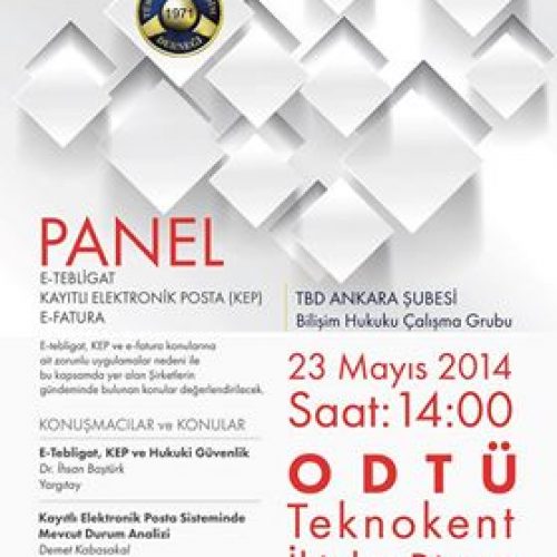 TBD Ankara Şubesi Bilişim Hukuku Çalışma Grubu tarafından, 23 Mayıs 2014 tarihinde ODTÜ Teknokent ev sahipliğinde Teknokent firmalarına (diger üniversiteleri de kapsayan) e-tebligat, KEP ve e-fatura konularını içeren Panel düzenlenecektir.