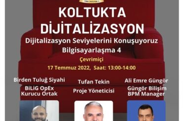 Türkiye Bilişim Derneği İstanbul Şubesi Dijital Dönüşüm ve Yenilikçilik Çalışma Grubumuzun düzenlediği “Koltukta Dijitalizasyon” webinarımızda Dijitalizasyon Seviyelerini konuşuyor olacağız. Oturumumuzun konusu Bilgisayarlaşma 3 Seviyesi olacaktır. 26 Haziran 2022 Pazar 13:00