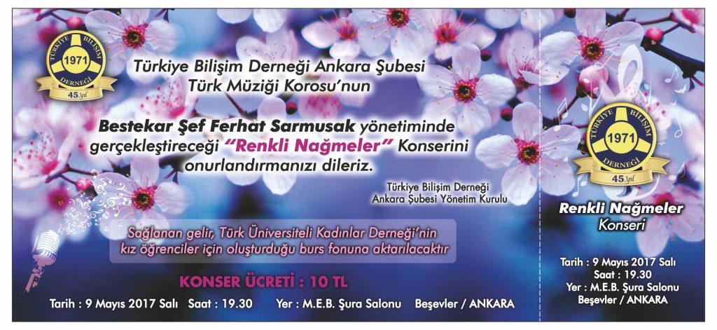 Türkiye Bilişim Derneği Ankara Şubesi Türk Müziği Korosunun Bestekar Şef Ferhat Sarmusak yönetiminde gerçekleştireceği “Renkli Nağmler” Koromuzu onurlandırmanızı dileriz.