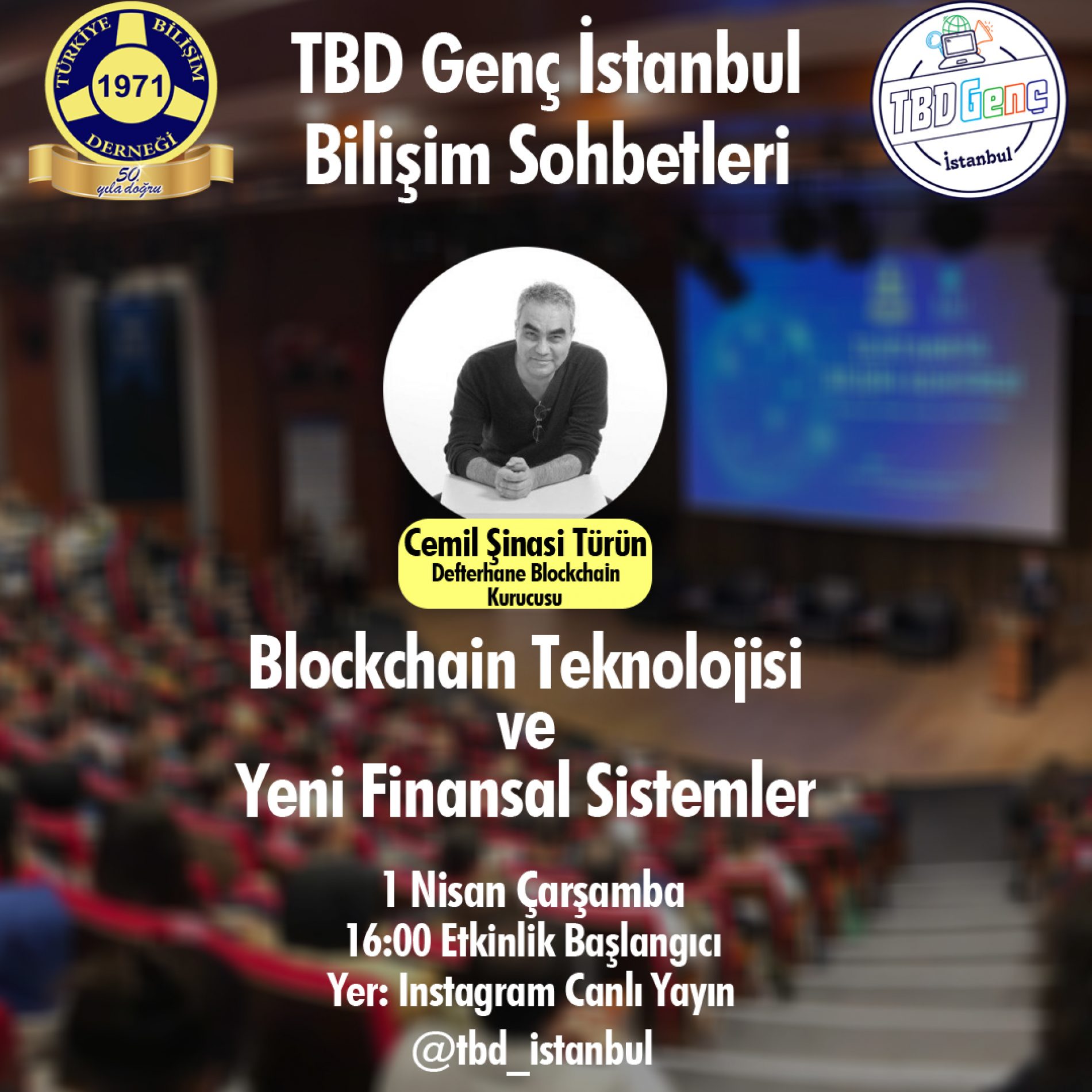 TBD Genç Çalışma Grubumuzun düzenlediği Bilişim Sohbetlerimize kaldığımız yerden devam ediyoruz. Sayın Cemil Şinasi Türün ile “Blockchain Teknolojisi ve Yeni Finansal Sistemler” üzerine bir sohbetimiz olacak. Siz de bu sohbete katılmak isterseniz 1 Nisan Çarşamba günü saat 16:00’da @tbd_istanbul instagram sayfamıza bekliyoruz.