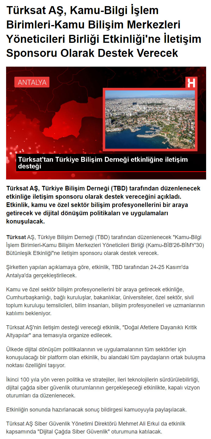 • Türksat AŞ, Kamu-Bilgi İşlem Birimleri-Kamu Bilişim Merkezleri Yöneticileri Birliği Etkinliği’ne İletişim Sponsoru Olarak Destek Verecek – HABERLER