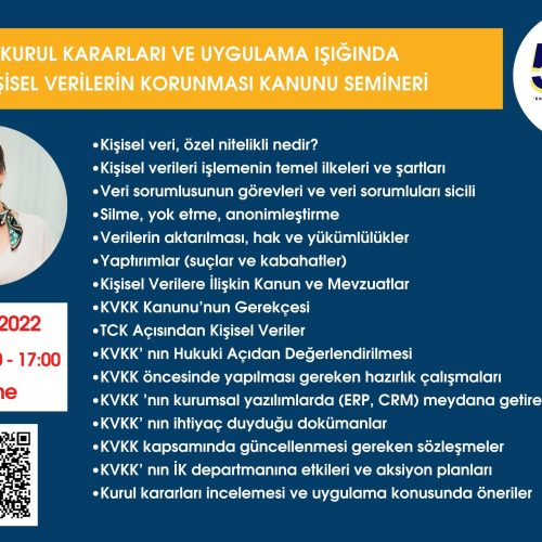 3 Şubat 2022 Perşembe,  Saat 10:00 – 17:00 Online Platform Pandemi döneminde firmalar için önemi daha da belirginleşen “Kurul Kararları ve Uygulama Işığında Kişisel Verilerin Korunması Kanunu Semineri” 3 Şubat