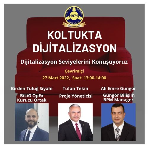 Türkiye Bilişim Derneği İstanbul Şubesi Dijital Dönüşüm ve Yenilikçilik Çalışma Grubumuzun düzenlediği “Koltukta Dijitalizasyon” webinarımızda Dijitalizasyon Seviyelerini konuşuyor olacağız. Oturumumuzun konusu Bilgisayarlaştırma Seviyesi olacaktır. 27 Mart 2022 Pazar 13:00 –