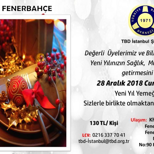 28 Aralık 2018 Cuma günü saat 19:30’ da Khalkedon Fenerbahçe de düzenleyeceğimiz Yeni Yıl Yemeğimize tüm bilişimci dostlarımız davetlidir. Sizlerle birlikte olmaktan mutluluk duyacağız. Lütfen aşağıdaki linkten katılımınızı bildiriniz. Yeni