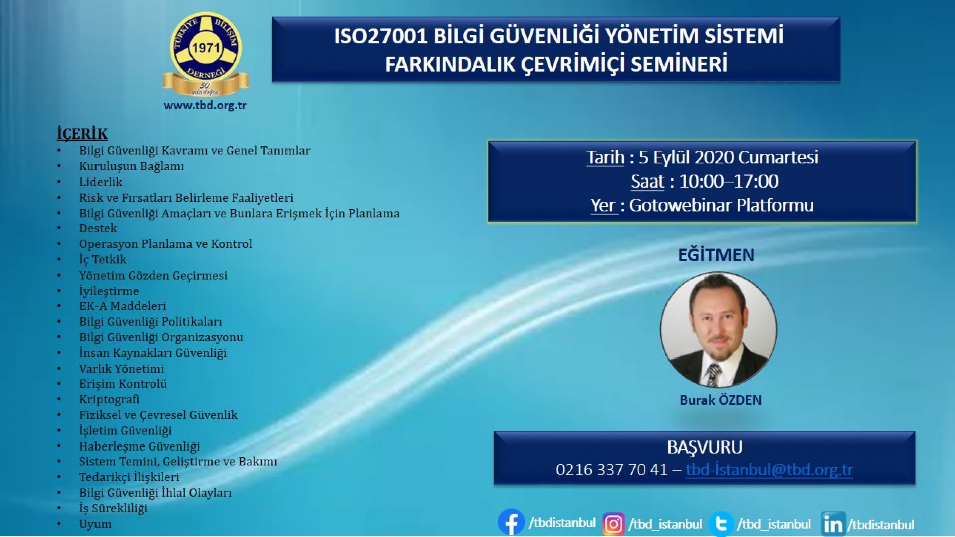 Burak ÖZDEN tarafından verilen “ISO27001 Bilgi Güvenliği Yönetim Sistemi Farkındalık” Seminerimiz 5 Eylül 2020 tarihinde online ortamda gerçekleştirilmiştir.