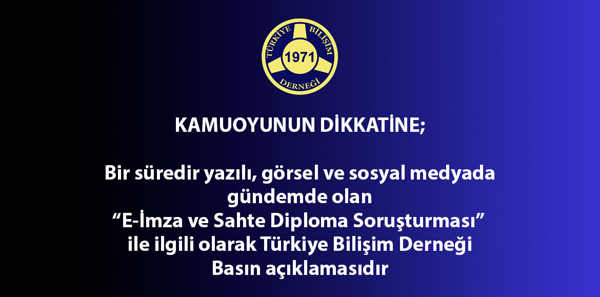 KAMUOYUNUN DİKKATİNE; Bir süredir yazılı, görsel ve sosyal medyada gündemde olan “E-İmza ve Sahte Diploma Soruşturması” ile ilgili olarak Türkiye Bilişim Derneği Basın açıklamasıdır
