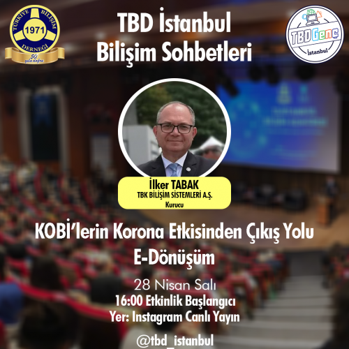 TBD İstanbul Şubesi Bilişim Sohbetlerimize Sayın İlker Tabak ile “KOBİ’lerin Korona Etkisinden Çıkış Yolu: E-Dönüşüm” konusuyla devam ediyoruz. Siz de bu sohbetimize katılmak isterseniz 28 Nisan Salı günü saat 16:00′