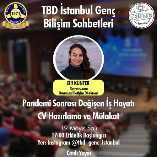 TBD Genç İstanbul Şubesi Bilişim Sohbetlerimize Sayın Elif Kunter ile “Pandemi Sonrası Değişen İş Hayatı” konusuyla devam ediyoruz. Bu keyifli sohbet için sizleri de 19 Mayıs Salı günü saat 17:00′