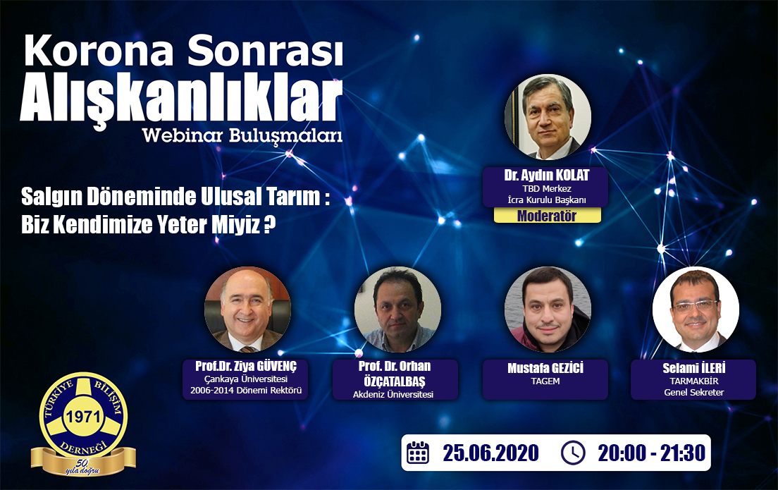 Teknolojideki son gelişmeler ülkemizde tarımı nasıl etkiledi? Pandemi döneminde ulusal tarımın önemi nedir? Tarım sektörünün durumu ve Ülkemizde tarımın dünü ve bu günü hakkında bilgi almak istiyorsanız, sizi de 25 Haziran 2020 Perşembe günü saat 20.00-21.30 saatleri arasında yapılacak “TBD Korona Sonrası Alışkanlıklar” Webinarları serisinin altıncısı olan “Salgın Döneminde Ulusal Tarım : Biz Kendimize Yeter Miyiz?” webinarına bekleriz.