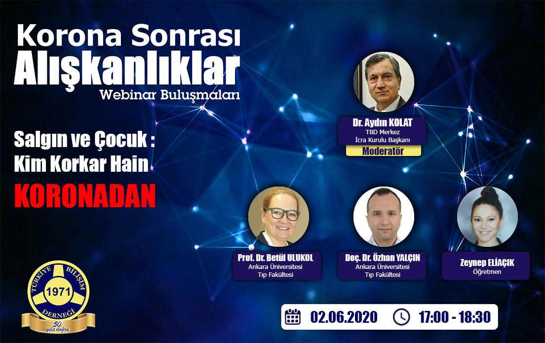 02 Haziran 2020 tarihinde saat 17.00-18.30 saatleri arasında “TBD Korona Sonrası Alışkanlıklar” Webinarları serisinin dördüncüsü olan “Salgın ve Çocuk: Kim Korkar Hain Koronadan” webinarını yapılmıştır.