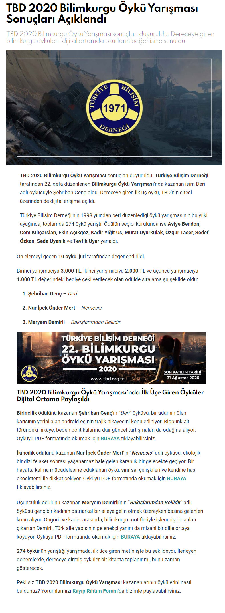 TBD 2020 Bilimkurgu Öykü Yarışması Sonuçları Açıklandı – KAYIP RIHTIM