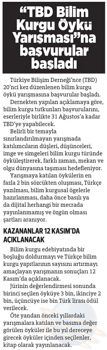 • “TBD Bilim Kurgu Öykü Yarışması”na Başvurular Başladı – YENİ BİRLİK