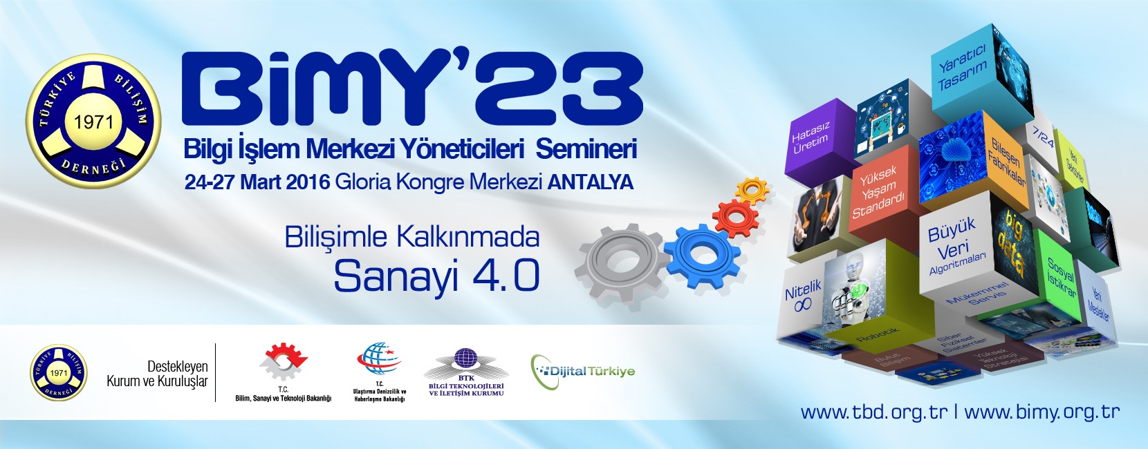 “Bilişimle Kalkınmada Sanayi 4.0” ana temasıyla 24-27 Mart 2016 tarihlerinde Antalya’da gerçekleştirdiğimiz TBD (BİMY’23) 23. Bilgi İşlem Merkezi Yöneticileri Semineri’nin etkinlik sonuç raporu yayınlandı. Rapora http://bimy.org.tr/etkinlik-sonuc-raporu/ adresinden ulaşabilirsiniz.