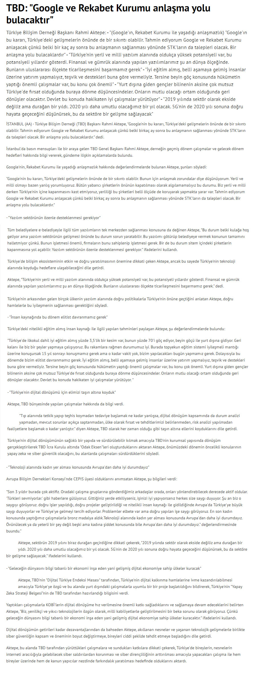 TBD: “Google ve Rekabet Kurumu Anlaşma Yolu Bulacaktır” – MYNET