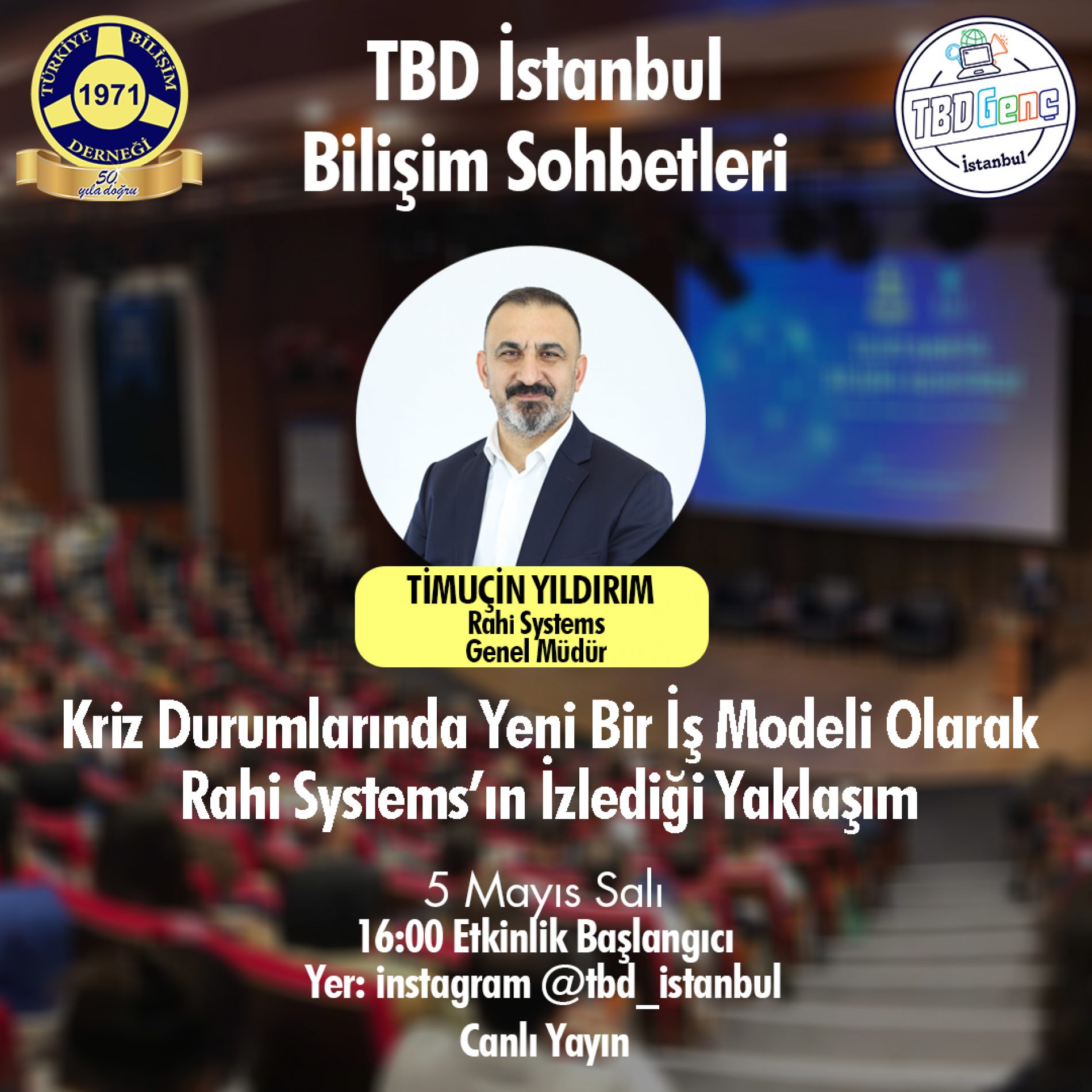 TBD İstanbul Şubesi Bilişim Sohbetlerimize Sayın Timuçin Yıldırım ile “Kriz Durumlarında Yeni Bir İş Modeli Olarak Rahi Systems’ın İzlediği Yaklaşım” konusuyla devam ediyoruz. Bu keyifli sohbet için sizleri de 5 Mayıs Salı günü saat 16:00′ da @tbd_istanbul instagram sayfamıza bekliyoruz.