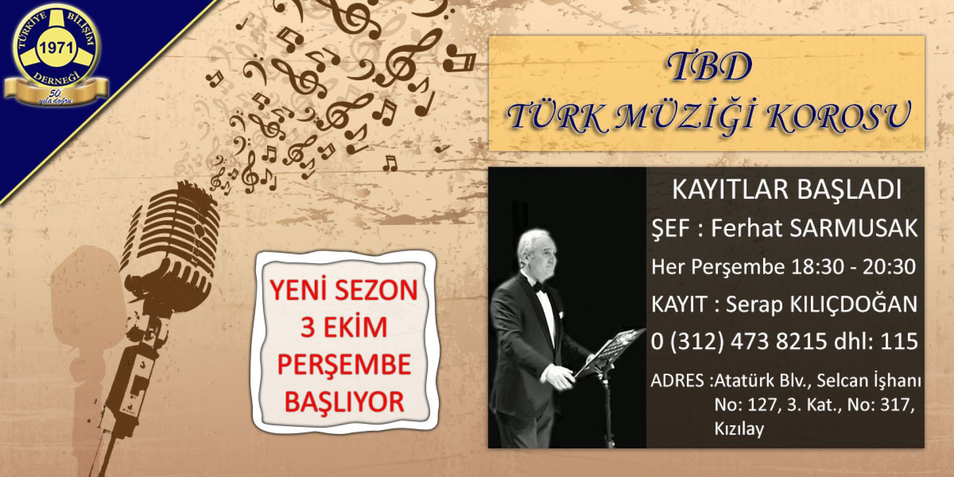 TBD Türk Müziği Koro kayıtları başladı. Yeni sezon 3 Ekim 2019 tarihinde başlıyor. Çalışmalar her perşembe 18:30 – 20:30 arasında Kızılay Selcan İşhanında olacaktır. Kayıt olmak için hemen bizimle iletişime geçiniz.