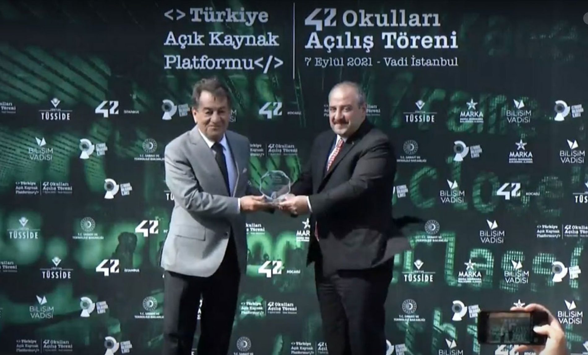 Bilişim Vadisi’nde T.C. Sanayi ve Teknoloji Bakanı Sayın Mustafa VARANK ve Açık Kaynak Platformu paydaşlarının katılımı ile gerçekleştirilen 42 Yazılım Okullarının açılış törenine Türkiye Bilişim Derneği Genel Başkanı Sayın Rahmi AKTEPE katılmıştır. Törende Bakan Sayın VARANK tarafından Açık Kaynak Platformu kurucu ortağı olan Türkiye Bilişim Derneği’ne plaket verilmiştir. TBD Genel Başkanı Sayın Rahmi AKTEPE plaketi Sayın Mustafa VARANK’tan almıştır.