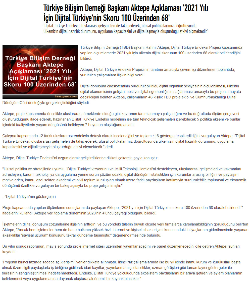 Türkiye Bilişim Derneği Başkanı Aktepe Açıklaması ‘2021 Yılı İçin Dijital Türkiye’nin Skoru 100 Üzerinden 68’ – BEYAZ GAZETE