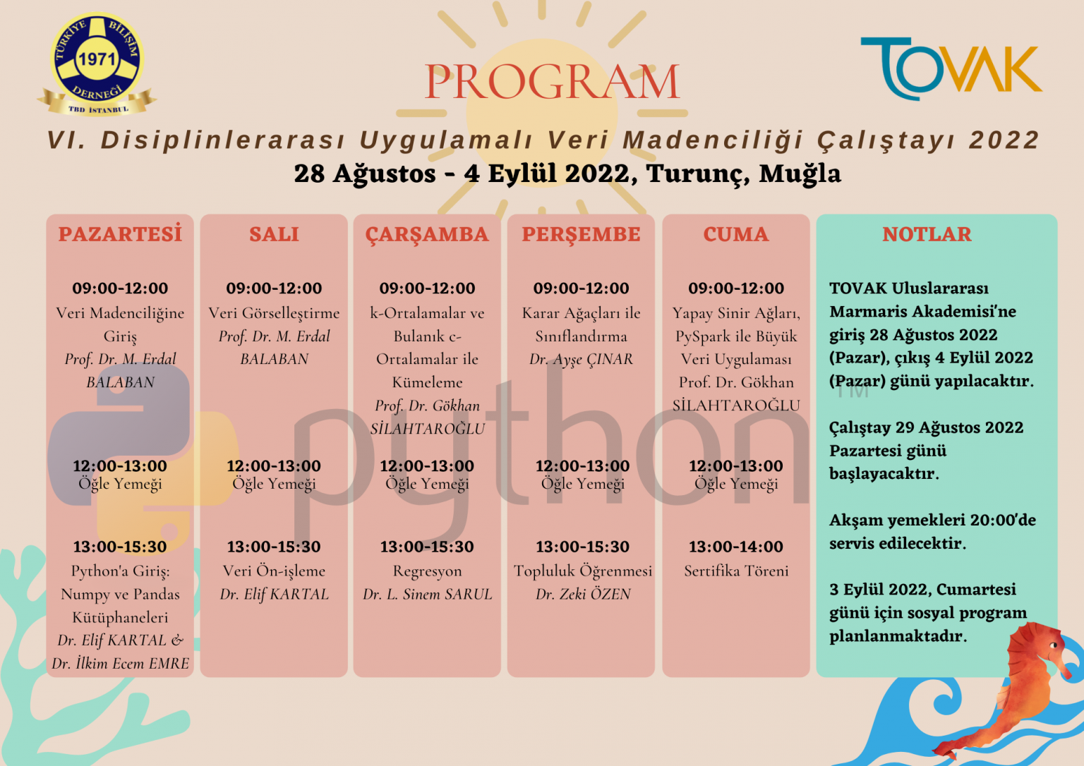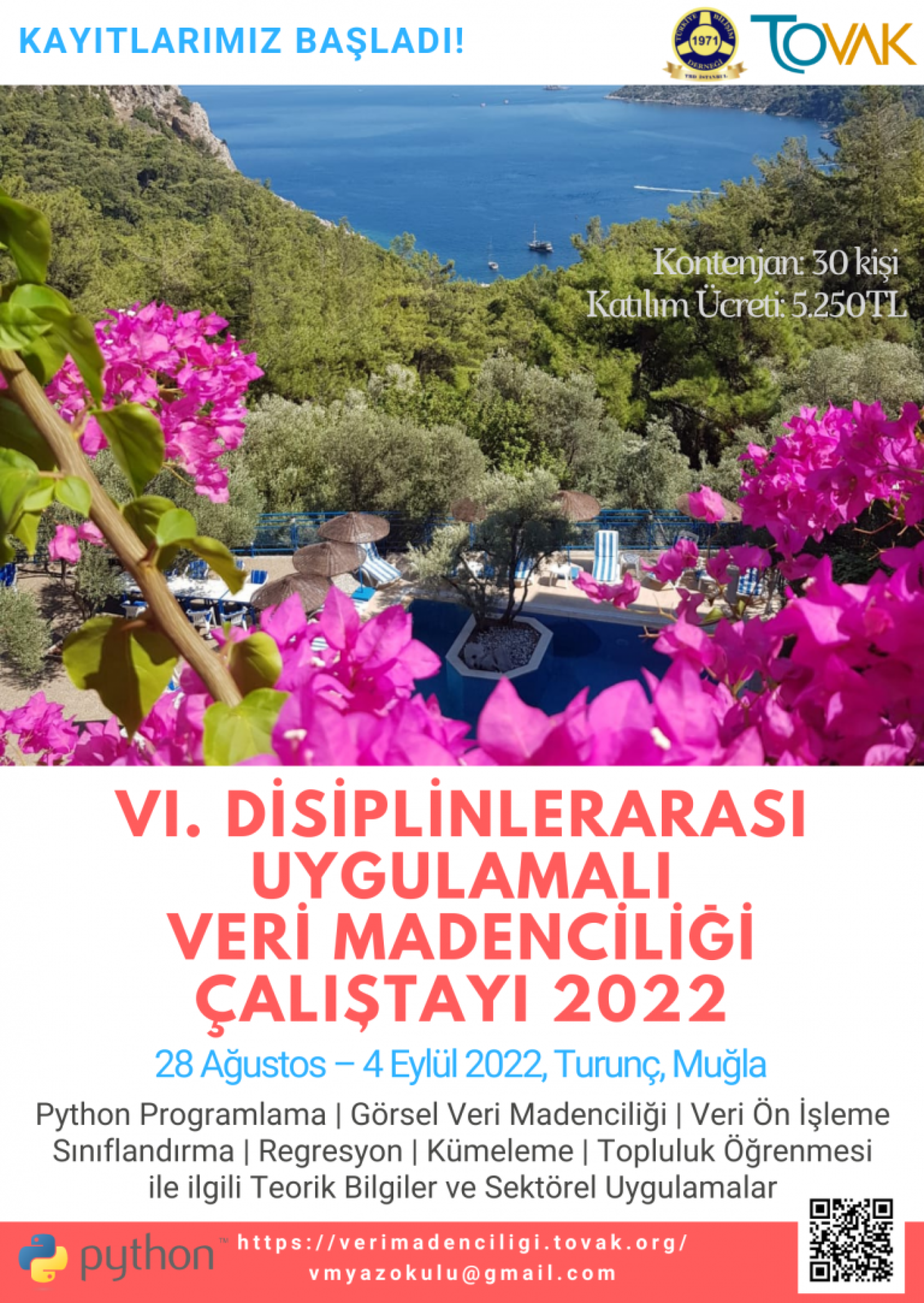 Çalıştay; Türkiye Bilişim Derneği İstanbul Şubesi Veri Bilimi Çalışma Grubu ve Türkiye Toplum Hizmetleri Vakfı (TOVAK) işbirliği ile TOVAK Uluslararası Marmaris Akademisi‘nde gerçekleştirilecektir. 28 Ağustos 2022 Pazar (Giriş) – 4 Eylül 2022 Pazar (Çıkış) tarihleri arasında yapılacak çalıştay ücreti;