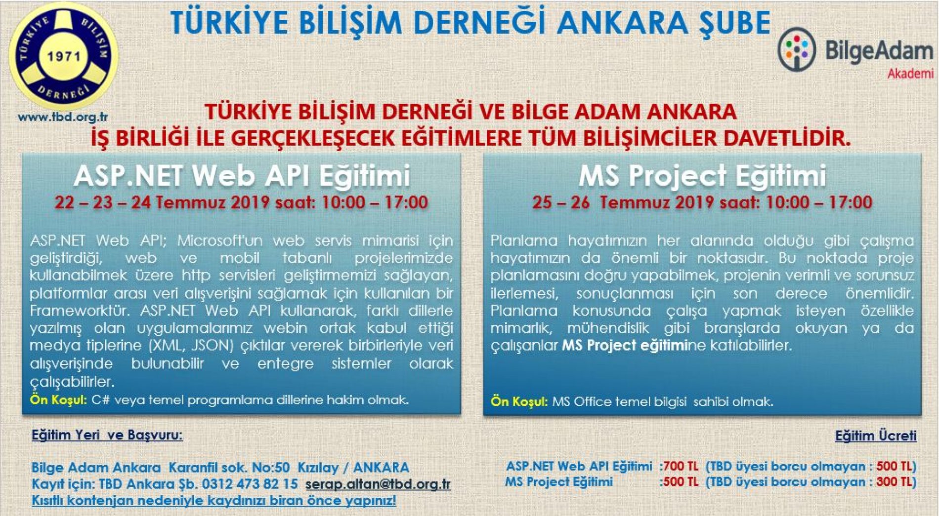 • Türkiye Bilişim Derneği ve Bilge Adam Ankara İşbirliği ile Gerçekleşecek Eğitimlerimize Kayıtlarınızı Bekliyoruz!
