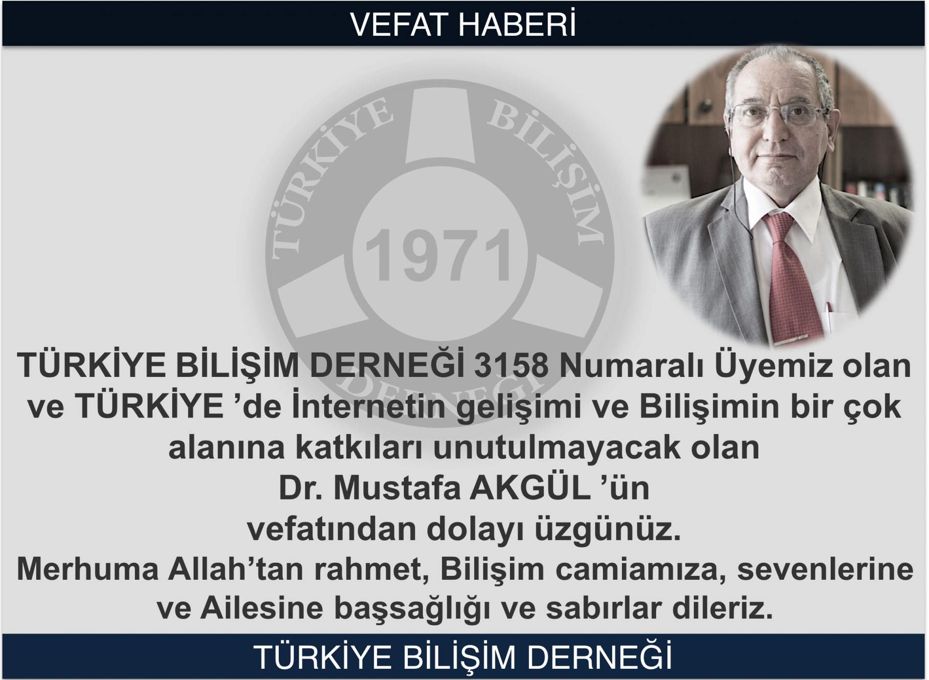 3158 Numaralı Üyemiz olan ve TÜRKİYE ’de İnternetin gelişimi ve Bilişimin bir çok alanına katkıları unutulmayacak olan Dr. Mustafa AKGÜL ’ün vefatından dolayı üzgünüz.