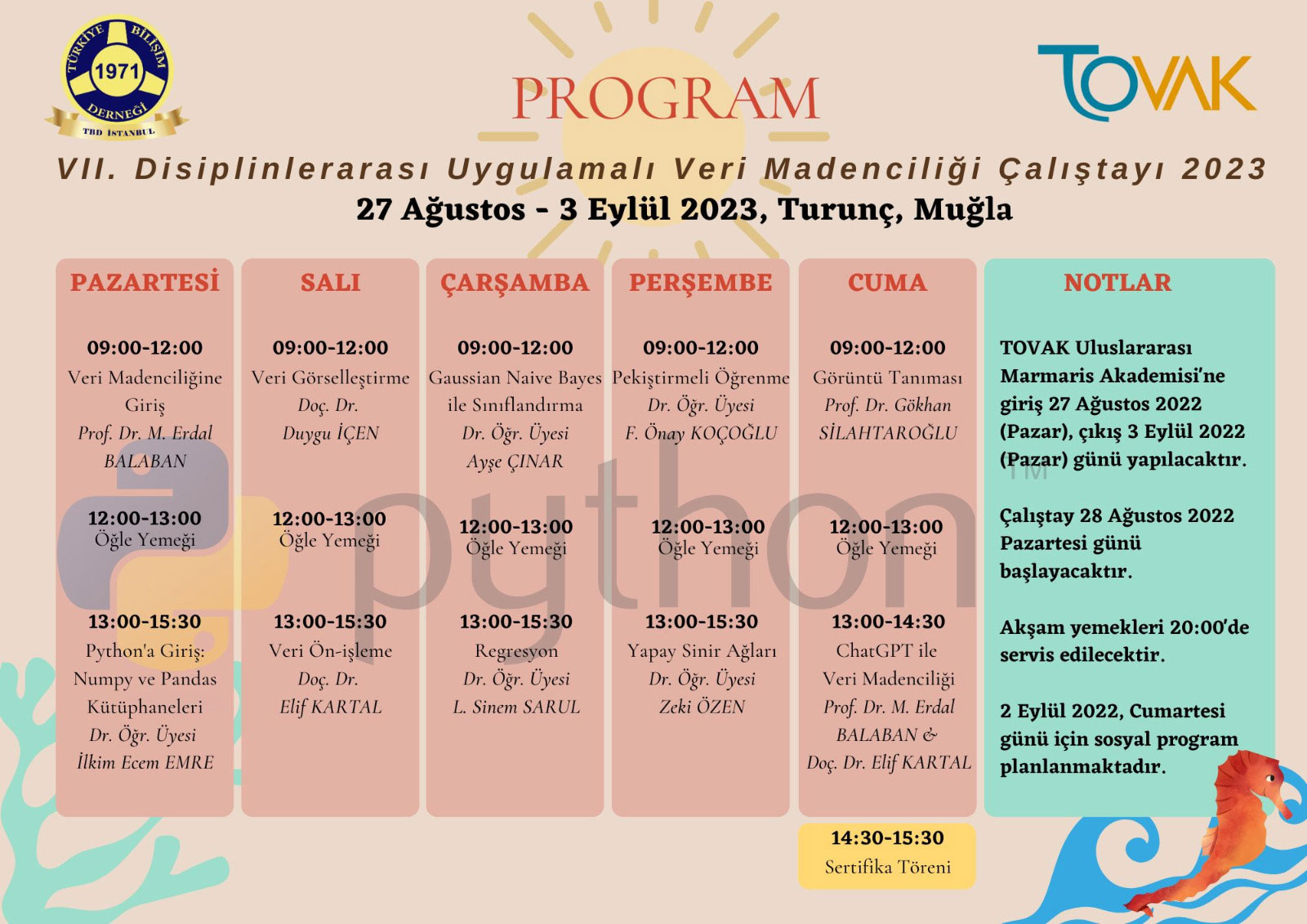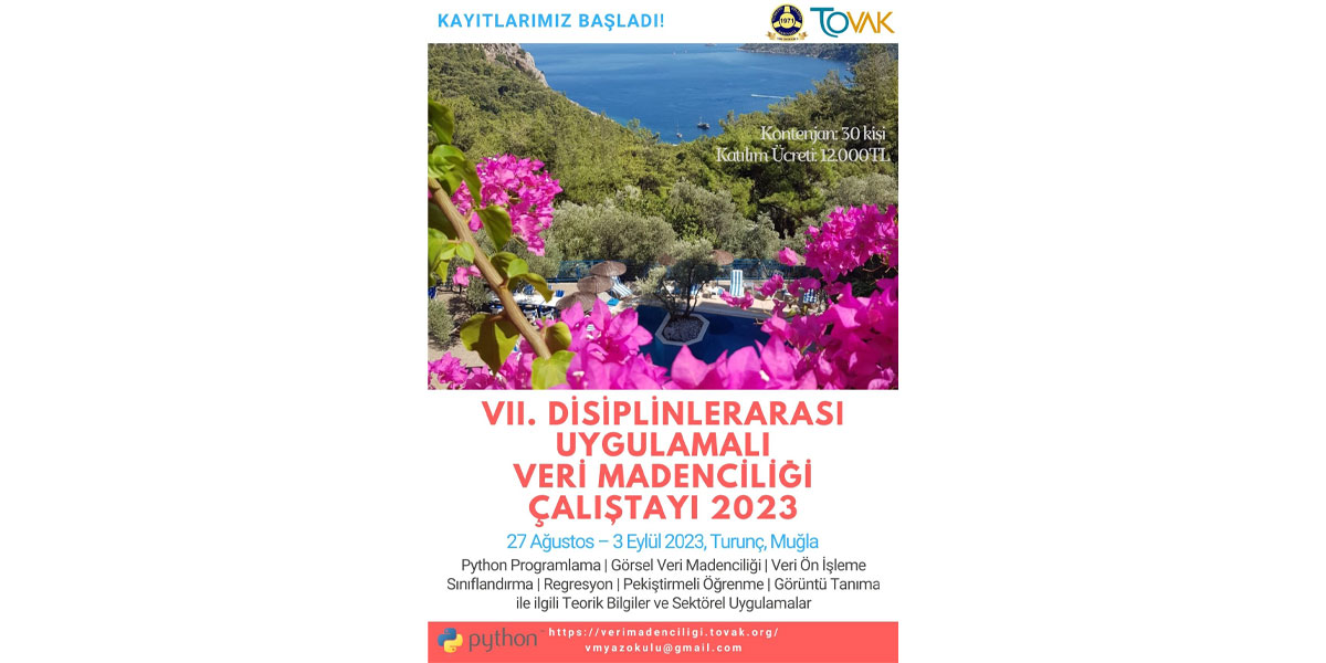 Çalıştay; Türkiye Bilişim Derneği İstanbul Şubesi Veri Bilimi Çalışma Grubu ve Türkiye Toplum Hizmetleri Vakfı (TOVAK) işbirliği ile TOVAK Uluslararası Marmaris Akademisi‘nde gerçekleştirilecektir. 27 Ağustos 2023 Pazar (Giriş) – 3 Eylül 2023 Pazar (Çıkış) tarihleri arasında yapılacak çalıştay ücreti;