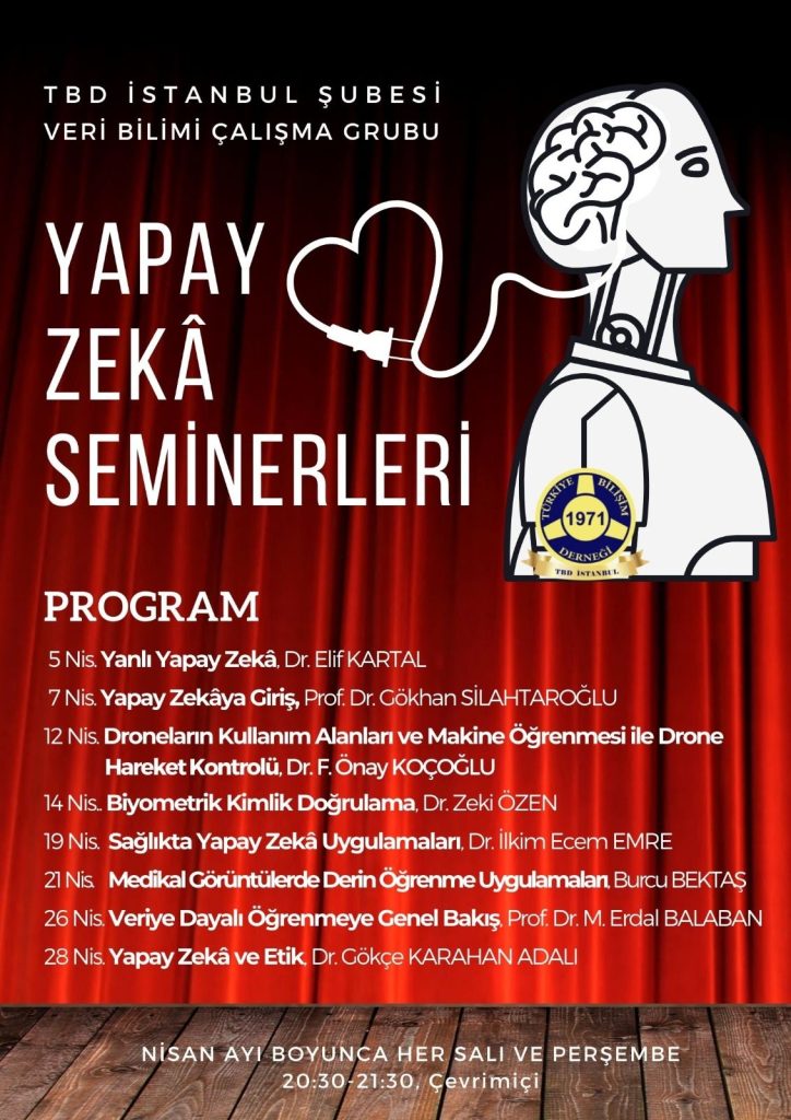 Türkiye Bilişim Derneği İstanbul Şubesi Veri Bilimi Çalışma Grubumuz tarafından, Nisan ayı boyunca her Salı ve Perşembe günü 20:30 – 21:30 saatleri arasında çevrimiçi düzenlenecek olan Yapay Zekâ Seminerlerimize davetlisiniz.