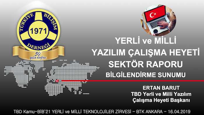 Söz konusu rapor (sürüm 2 içeriği) YERLİ ve MİLLİ YAZILIM Çalışma Heyeti Başkanı Ertan BARUT tarafından 16 Nisan 2019 tarihinde Ankara BTK Konferans Salonunda TBD KaMU-BİB’21 “Yerli Milli Teknolojiler Zirvesi” 1. oturum Yerli ve Milli Yazılım Çalıştayında sunulmuştur. Raporun PDF hali ve oturumun Video kaydına aşağıdaki bağlantılardan ulaşabilirsiniz.